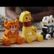 Az állatrajongókra rengeteg játék vár egy elefánttal, tigrissel, zsiráffal és pandával. Az építés és átalakítás, a kocsik felsorakoztatása, az állatok egymásra pakolása, valamint a vonaton való elhelyezésük és levételük során a gyermekek fejlesztik a finommotoros készségeiket, és felfedezik a szerepjáték varázslatos világát. Az innovatív funkciók, mint a zsiráf billegő nyaka, még több vidámságot csempésznek a játékos tanulásba. A modellek életnagyságú képeit ábrázoló építőkártyákon a gyermekek elhelyezhetik az elemeket. Ha még több mókára vágynak, más kerekes DUPLO játékokkal is kombinálhatják a vonatot.
